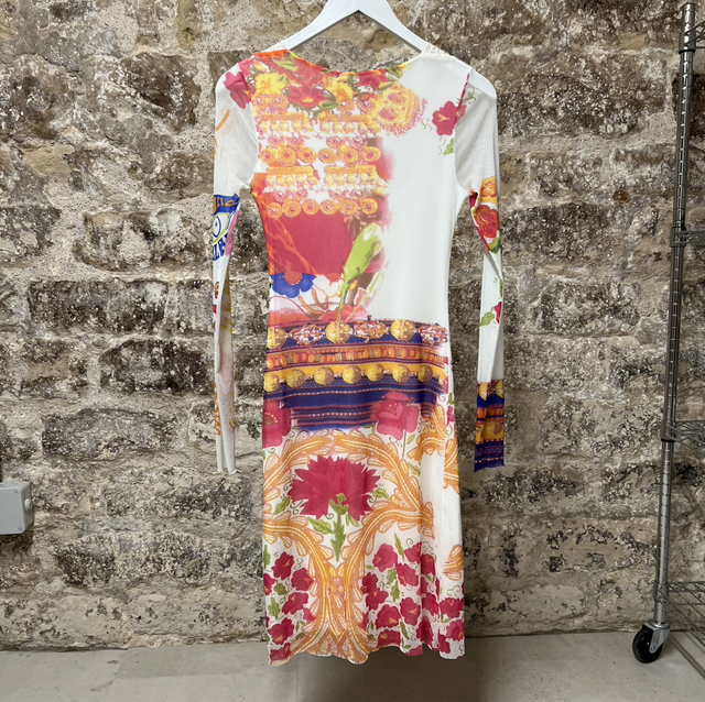 Robe beige mesh imprimé fleurs décolleté dentelle manches longues.