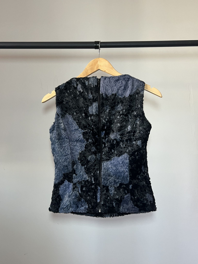 Hairy top. Blue and black cow print synthetic fur.